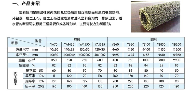 塑料盲溝是由塑料芯體外包裹濾布組式。塑料芯體是以熱可塑性合成樹脂為主要原料,經過改性,在熱熔狀態下,通過噴咀擠壓出細的塑料絲條,再通過成型裝置將擠出的塑料絲在結點上熔接,形成三維立體網狀結構。